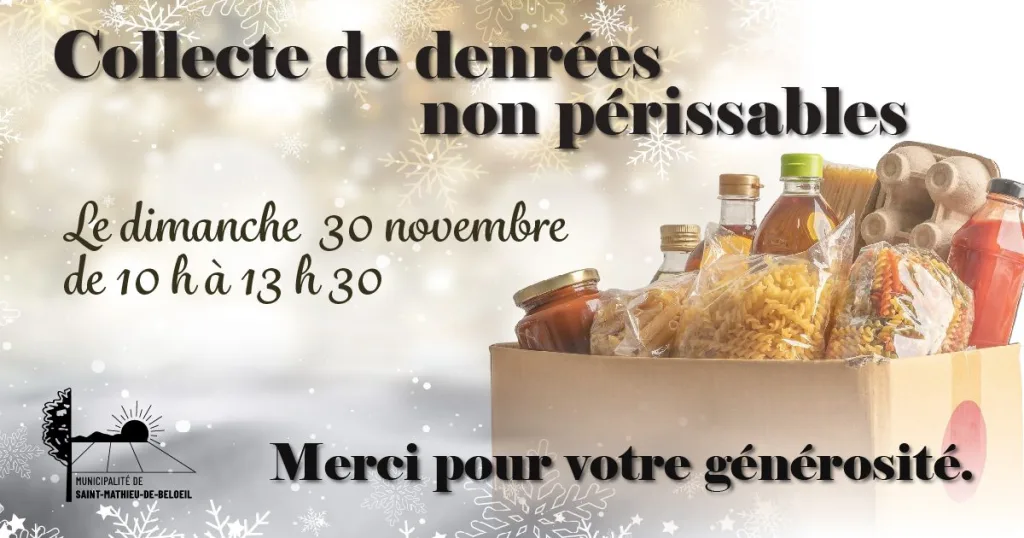 Le dimanche 30 novembre, entre 10 h et 13 h 30, les membres de la troupe de scouts 1ère Claire Flamme, accompagnés de bénévoles, parcourront les rues de Saint-Mathieu-de-Beloeil afin de recueillir des denrées non périssables au profit de l’organisme communautaire Le Grain d’Sel, qui soutient les familles dans le besoin.