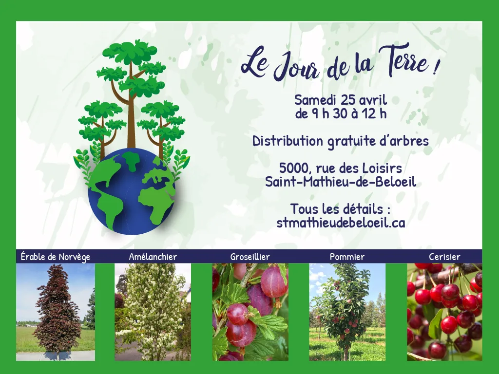 Consultez la belle variété d’arbres qui seront distribués sur le site web de la municipalité : www.stmathieudebeloeil.ca/loisirs-culture/evenements/celebrons-le-jour-de-la-terre/