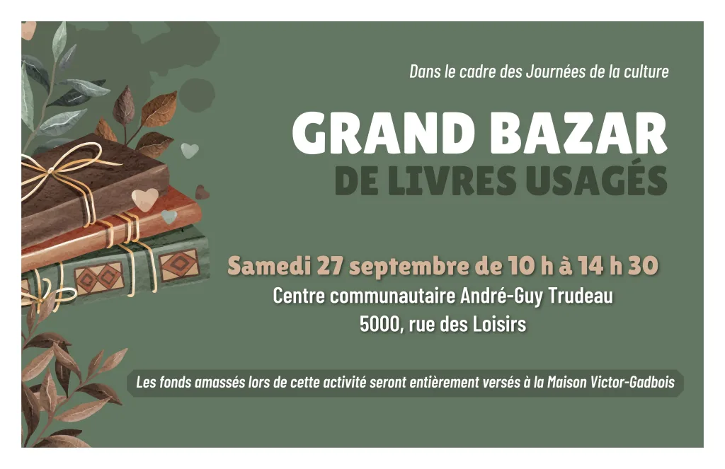 Dans le cadre des Journées de la culture, la bibliothèque municipale organise, pour la 3e année consécutive, le Grand bazar de livres usagés. Romans, albums, bandes dessinées, revues, articles promotionnels, et plus encore seront à vendre à petit prix ! C’est le moment de venir faire l’acquisition d’oeuvres littéraires et de garnir votre bibliothèque personnelle.