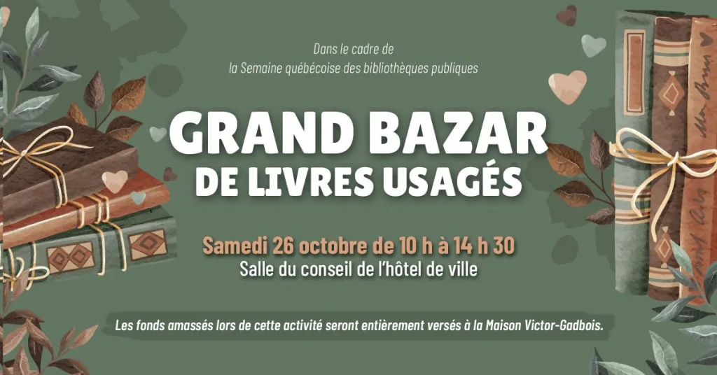 Dans le cadre de la Semaine Québécoise des bibliothèques publiques, la Municipalité de Saint-Mathieu-de-Beloeil vous invite à visiter le grand bazar de livres usagés organisé par la bibliothèque Ryane-Provost qui aura lieu le samedi 26 octobre prochain de 10 h à 14 h 30 dans la salle du conseil de l’hôtel de ville.