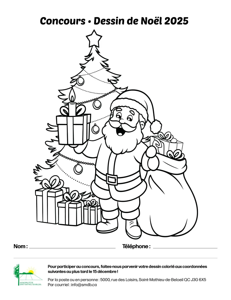 Le tirage au sort, effectué par le Père Noël, sera diffusé sur la page Facebook municipale le 20 décembre. Le gagnant se verra remettre un panier cadeau de Noël d’une valeur de 25 $. Tous les dessins reçus seront exposés à la bibliothèque du 1er décembre au début janvier. À vos crayons !