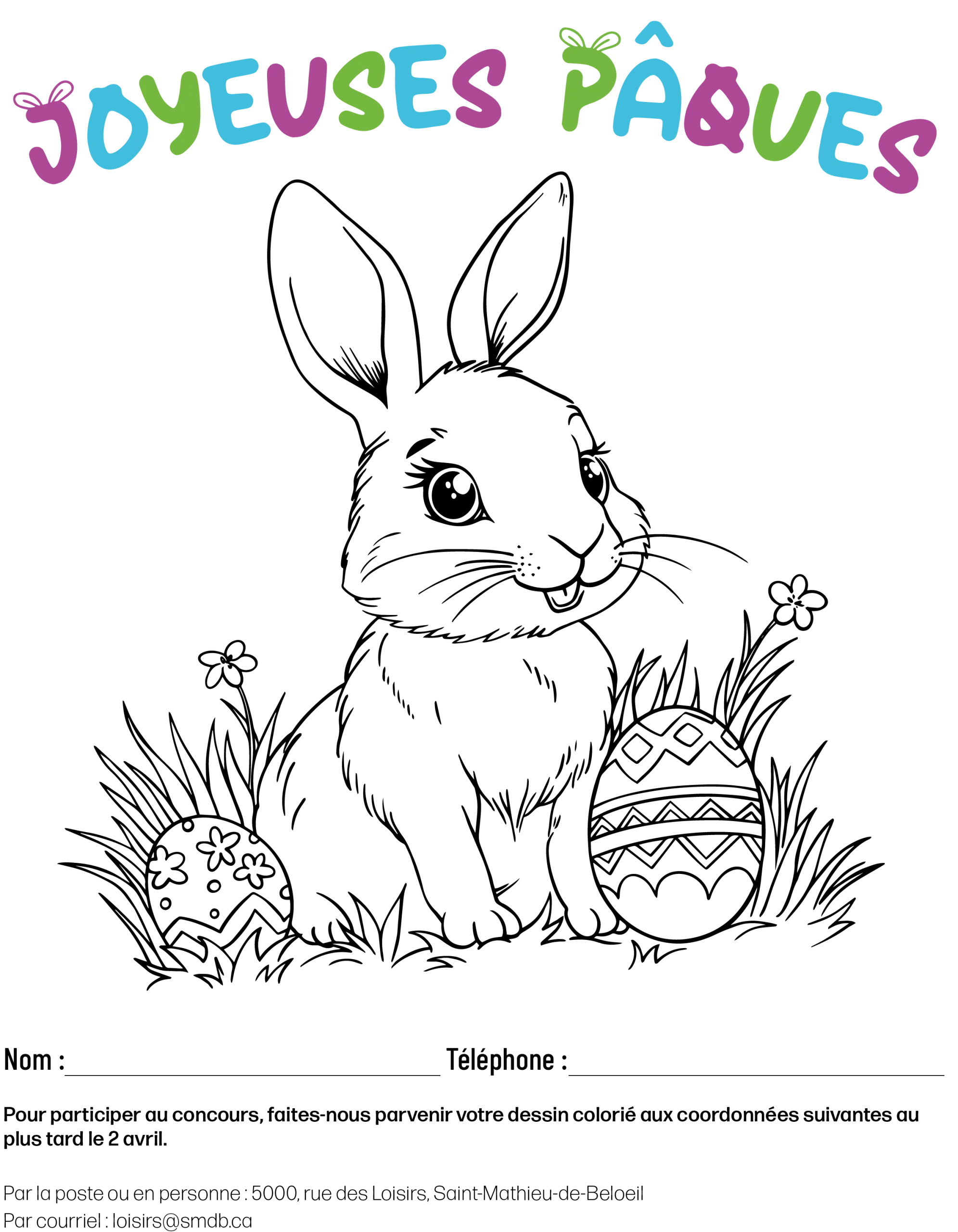 Pour doubler tes chances de gagner, fait-nous parvenir en personne ou une copie numérisée de votre coloriage et vos coordonnées par courriel à loisirs@smdb.ca, et ce, au plus tard le 2 avril.