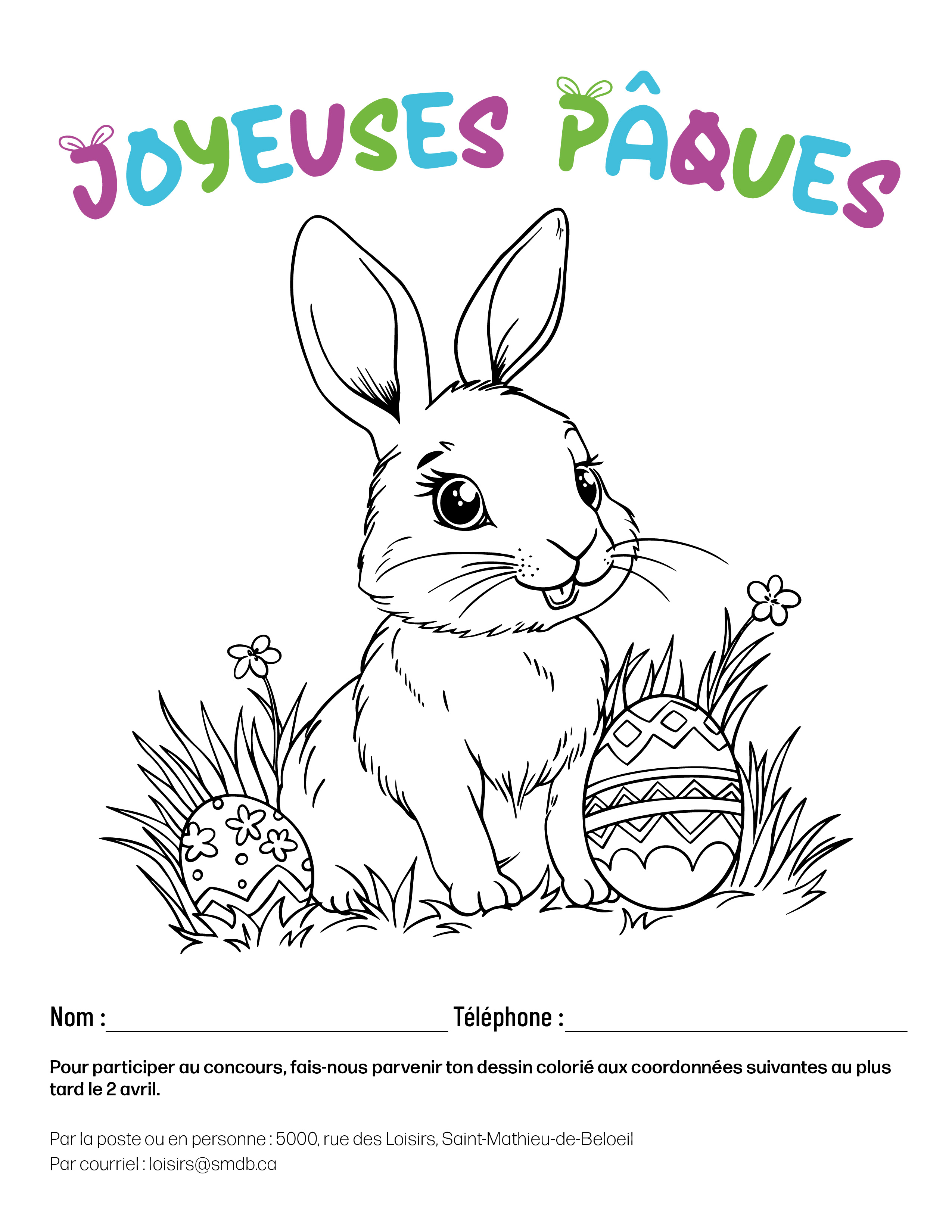 Pour doubler tes chances de gagner, fait-nous parvenir en personne ou une copie numérisée de votre coloriage et vos coordonnées par courriel à loisirs@smdb.ca, et ce, au plus tard le 2 avril.